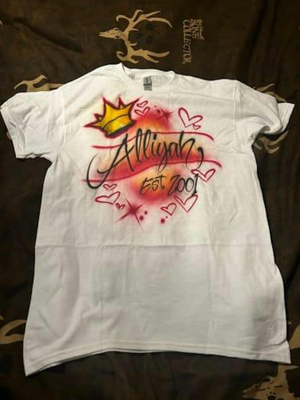 Show your style boldly with a personalized 'Script Crown + Tiny Hearts' airbrush design. Ideal for special occasions, unique apparel, or unforgettable gifts.