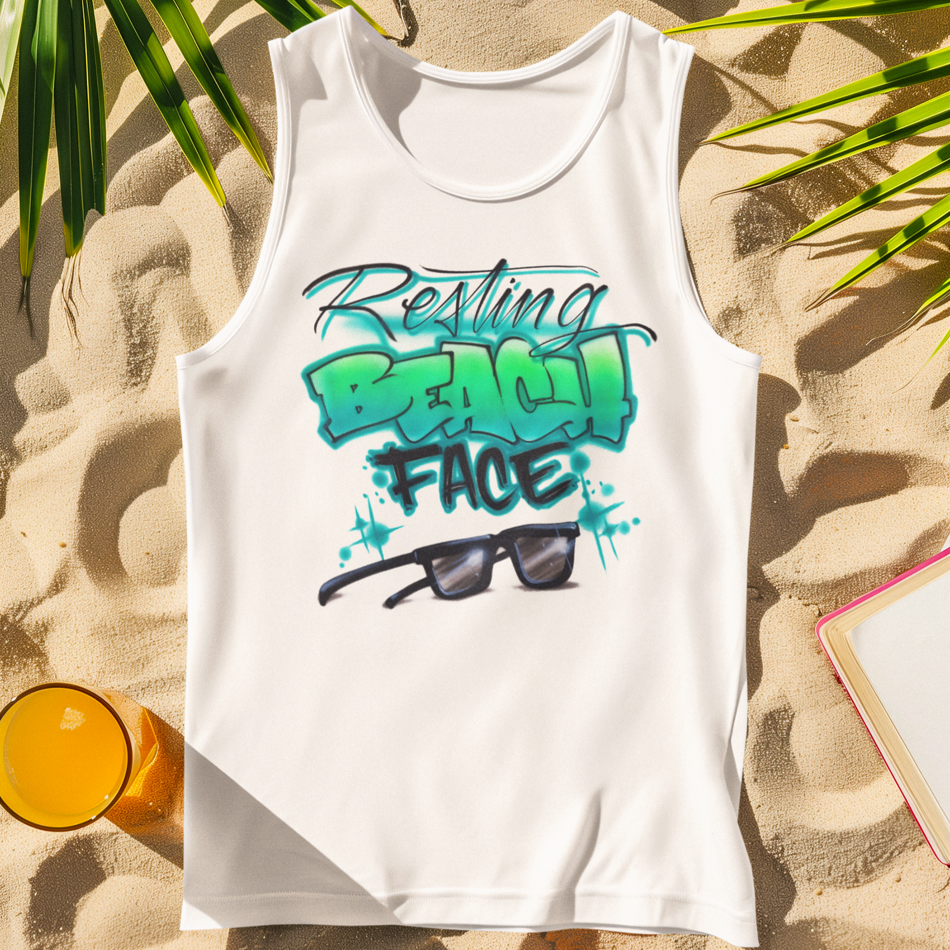 Own your sunny sass with our “Resting Beach Face” design, highlighted by stylish sunglasses. Perfect for playful, summery airbrush apparel.