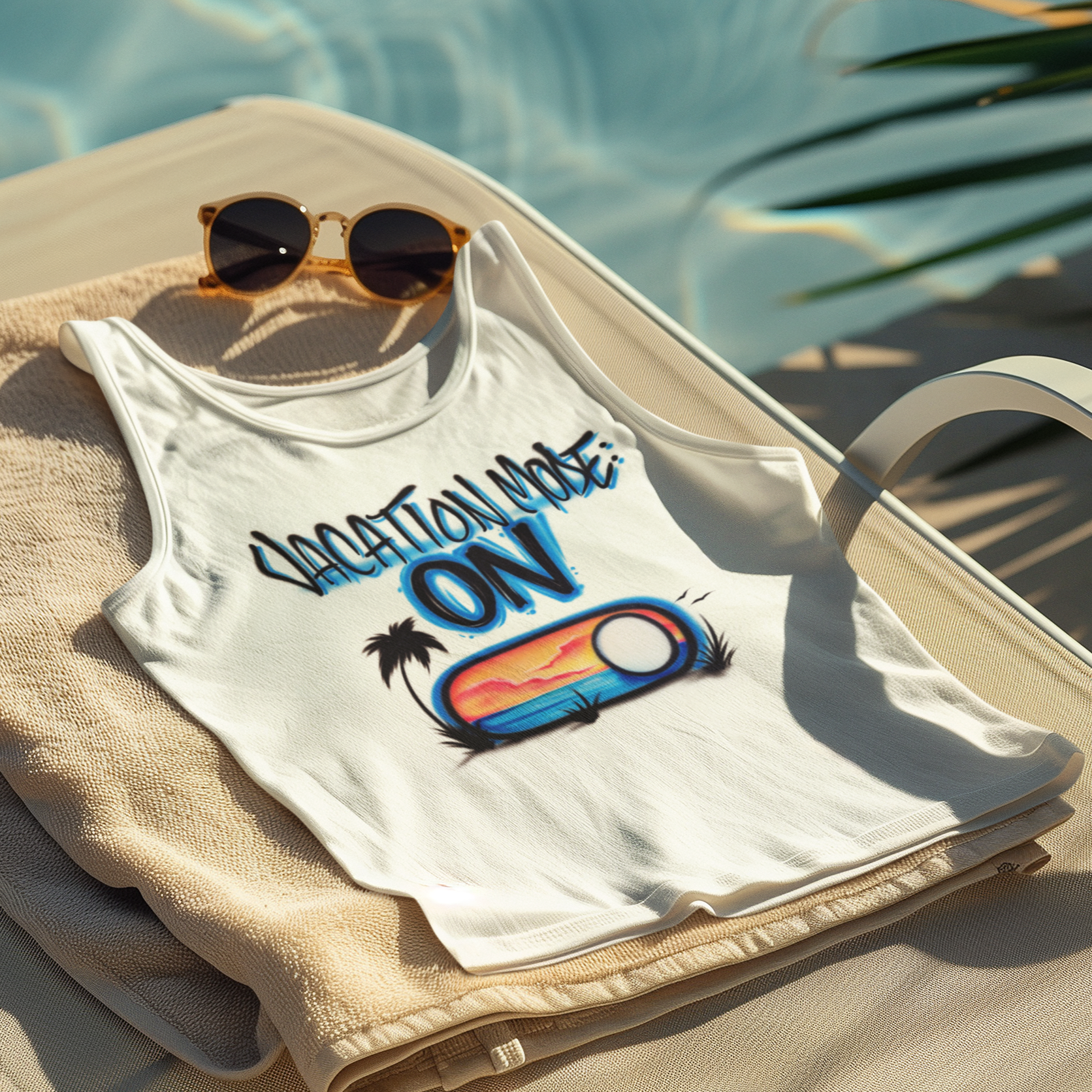 Switch to full relaxation with our “Vacation Mode: ON” design. Featuring a vibrant sunset in a toggle switch motif, it’s a fun way to show your getaway spirit.